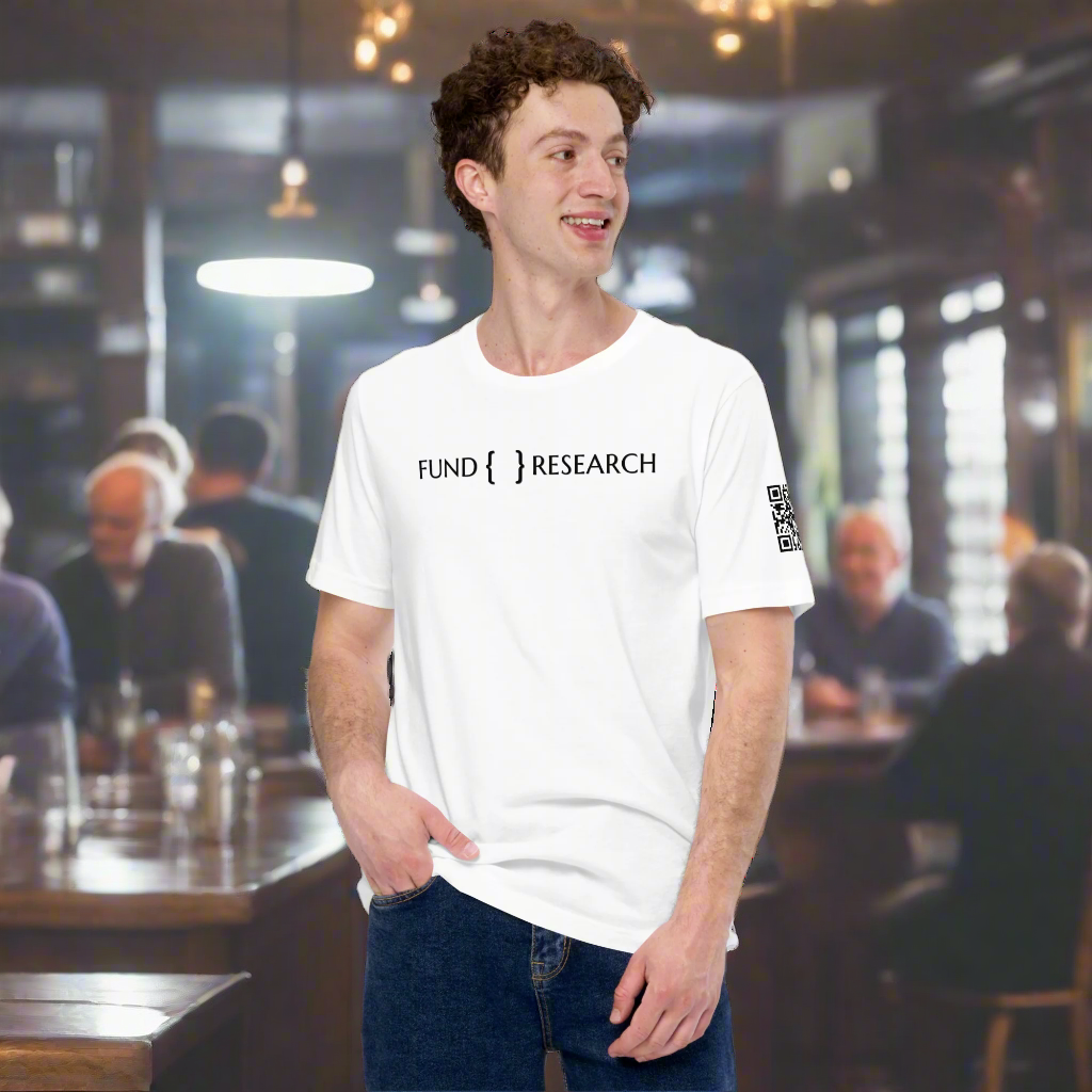 The Impact Tracker Tee – Standard Edition is the foundation of FundResearch’s wearable mission. The bold { } brackets at center are left open on purpose—your purchase helps decide what fills them next. Right sleeve includes a QR code that links directly to our live tracker, so you can watch funding move as projects progress. Inside collar reads: “This Tee Funds R&D.”